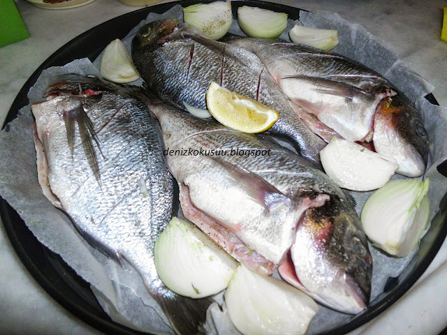 Temizlenmiş balıkları iyice yıkayıp süzdükten sonra fırın tepsisine yağlı kağıt serip balıkları üzerine dizin.Balıkların içlerine tuz serpin, kabuğu soyulmuş limonları dörde bölerek her balığın içine bir parça koyun,karabiber serpin,defne yapraklarınıda yerleştirip içlerine biraz sıvıyağ gezdirin.Soğanları soyup dörde bölün tepsiye soğanlarıda yerleştirin,200 derecede ısınmış fırında pişirin.