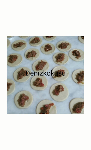 İç malzemeden 1 tatlı kaşığı alıp hamurların ortasına yayın,uç kısımlarından bastırıp pide şekli verin,
