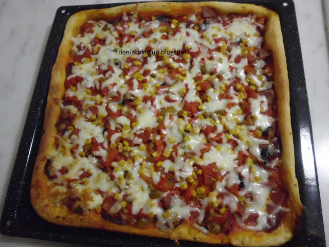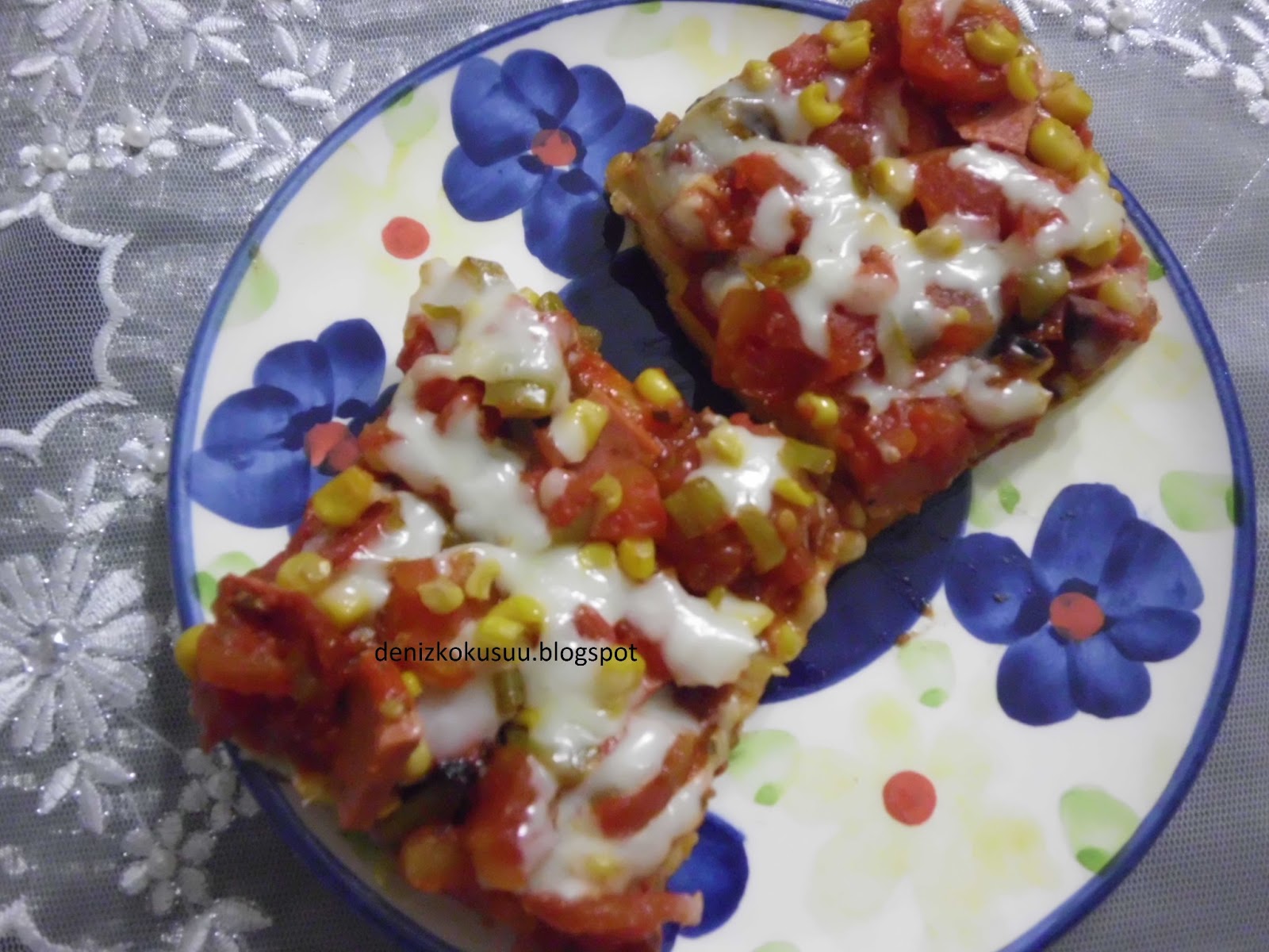 Üzerine dilediğiniz malzemeyi karıştırıp ,yayın(ben sucuk,salam,zeytin,mısır,domates ve biber kullandım)
