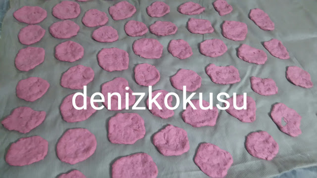 Kızılcıkları tencereye alıp üzerine 1 su bardağı su ekleyip kaynatıyoruz.Elimizi yakmayacak kadar ılınınca süzgeçten geçiriyoruz.Unu azar azar ekleyip yoğuruyoruz.Hamurdan parçalar koparıp elimizde inceltip bezin üzerine seriyoruz.