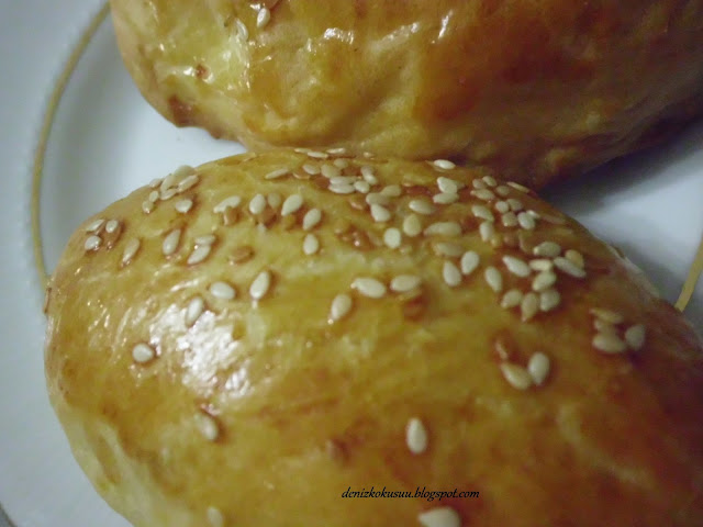 iç malzemesini karıştırın,hamurdan ceviz büyüklüğünde parçalar koparıp elinile açın iç harcı ortasına koyup yarım ay şekli verin üzerine yumurta sarısı sürün,susam serpip 180 derecede ısıtılmış fırında pişirin.